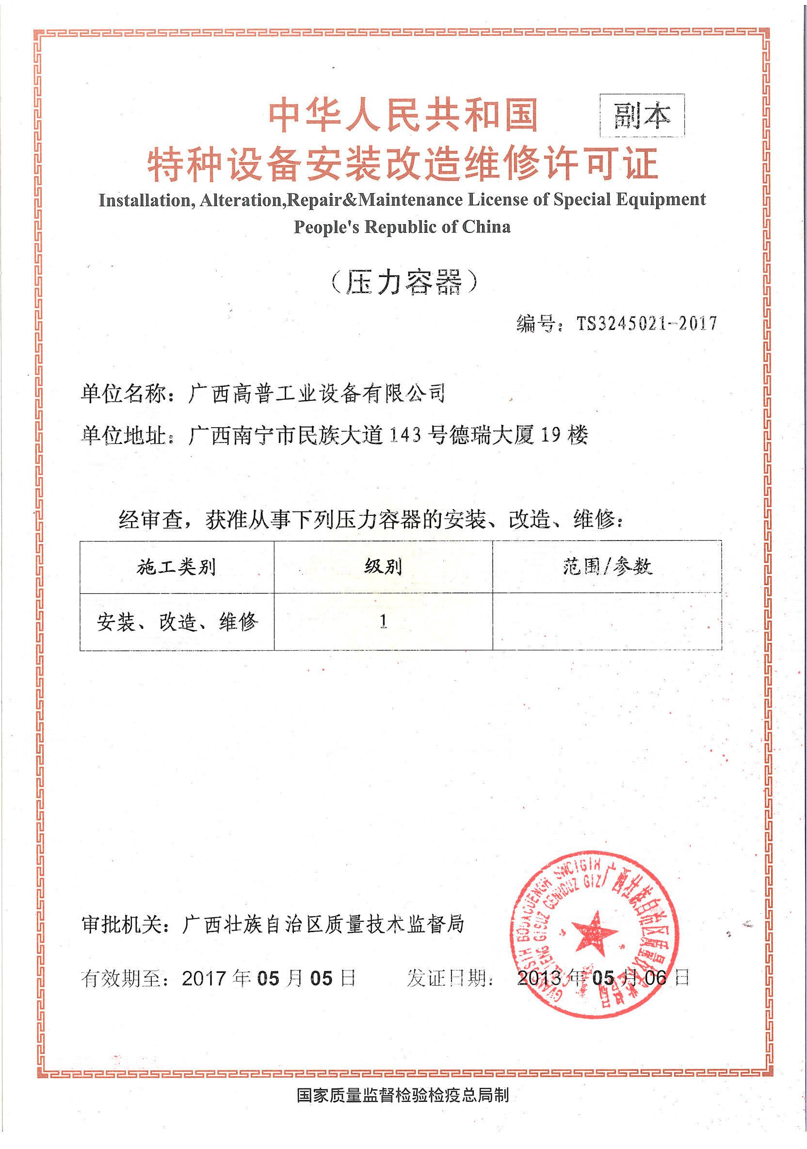 本公司是高新技術(shù)企業(yè),持有國家技術(shù)監(jiān)督局頒發(fā)的1級《特種設(shè)備安裝、改造、維修(鍋爐)》許可證,1級許可證是最高級別,可安裝、改造、維修任何形式、參數(shù)的鍋爐設(shè)備。并持有《壓力管道》安裝、改造維修許可證,1級《壓力容器》安裝、改造、維修,機(jī)電設(shè)備安裝工程專業(yè)承包3級等資質(zhì)。